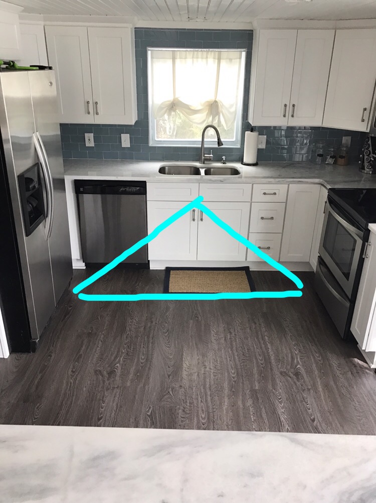 The basic idea is that the three areas most in use in a kitchen are the refrigerator, the sink, and the stove. These areas should be laid out in a way that you can hop around to each fluently.