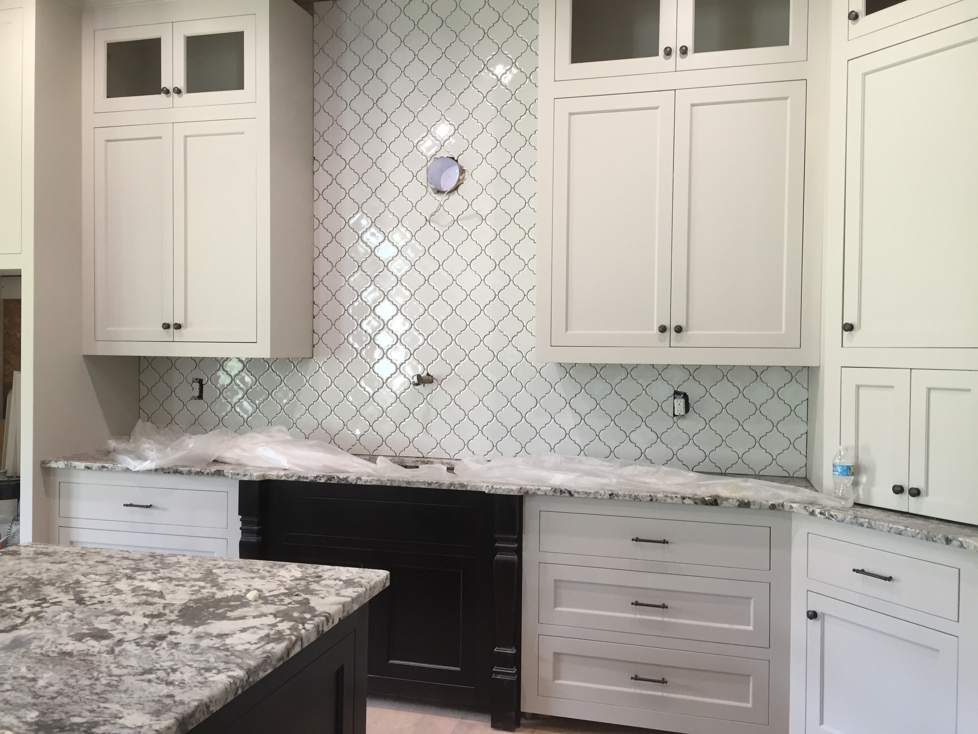 The backsplash was hard I knew I wanted white and there would have been many options that would all look good in here but this tile adds elegance a simple white subway tile can’t. We considered doing a Carrerra marble subway tile but then found this arabesque tile that was just beautiful with the cabinet color and granite.