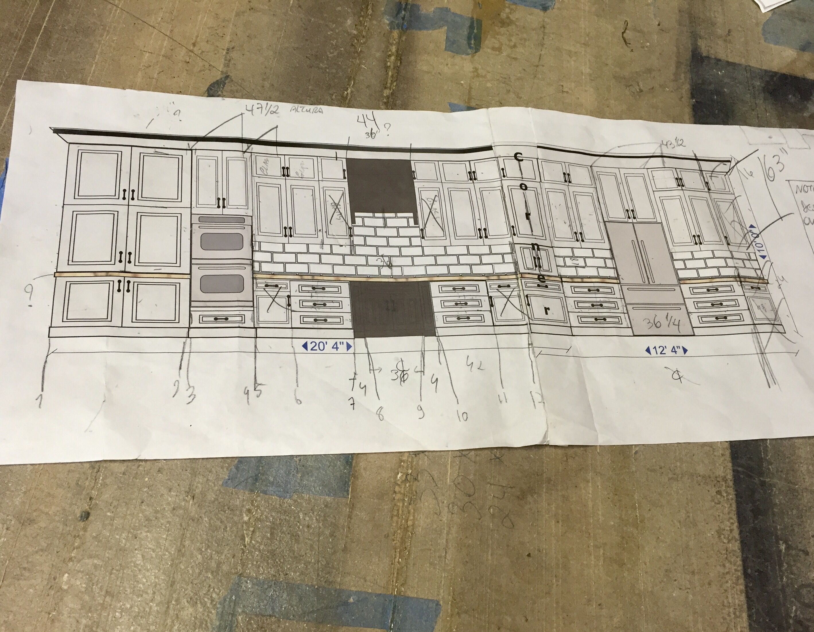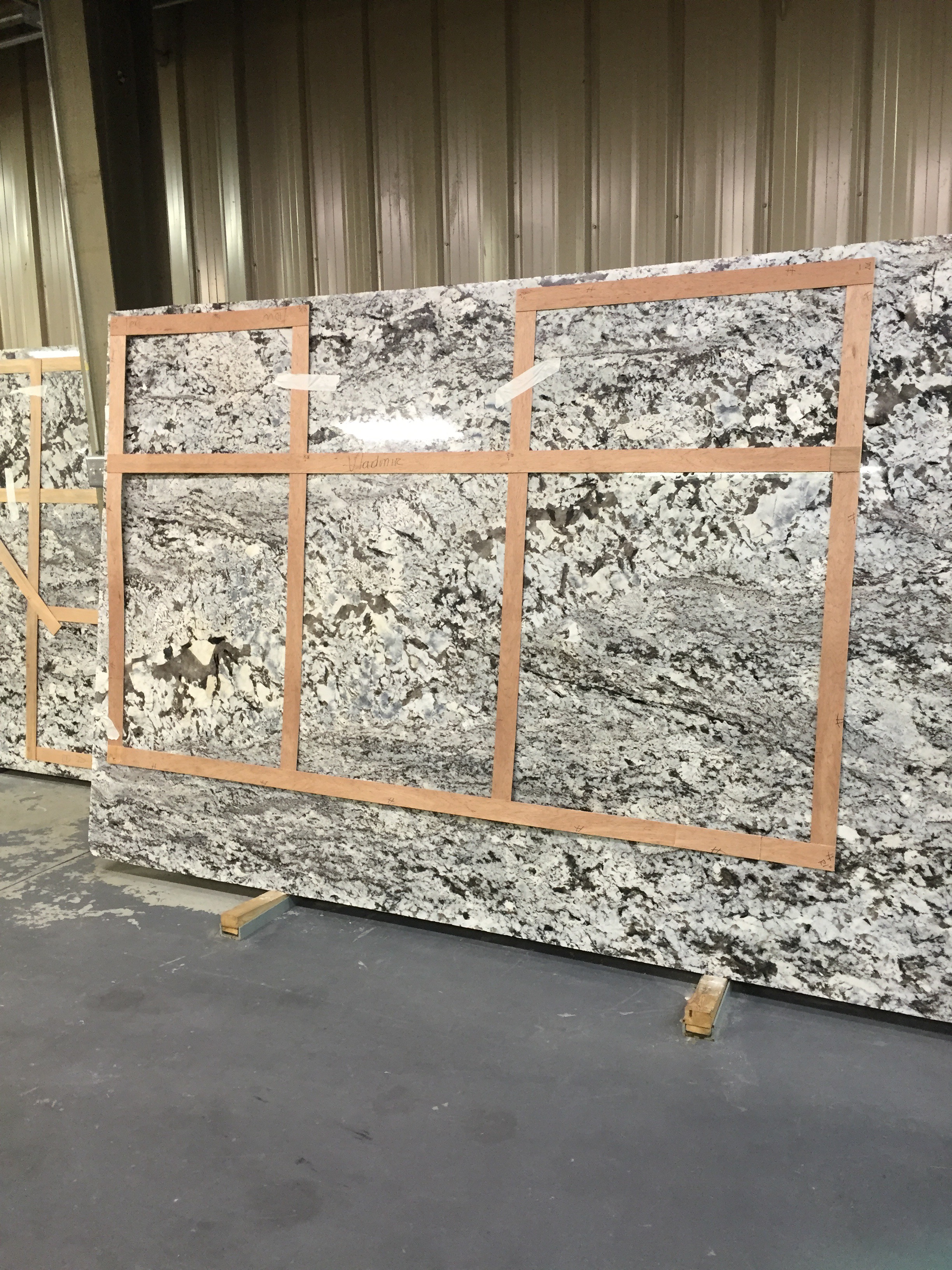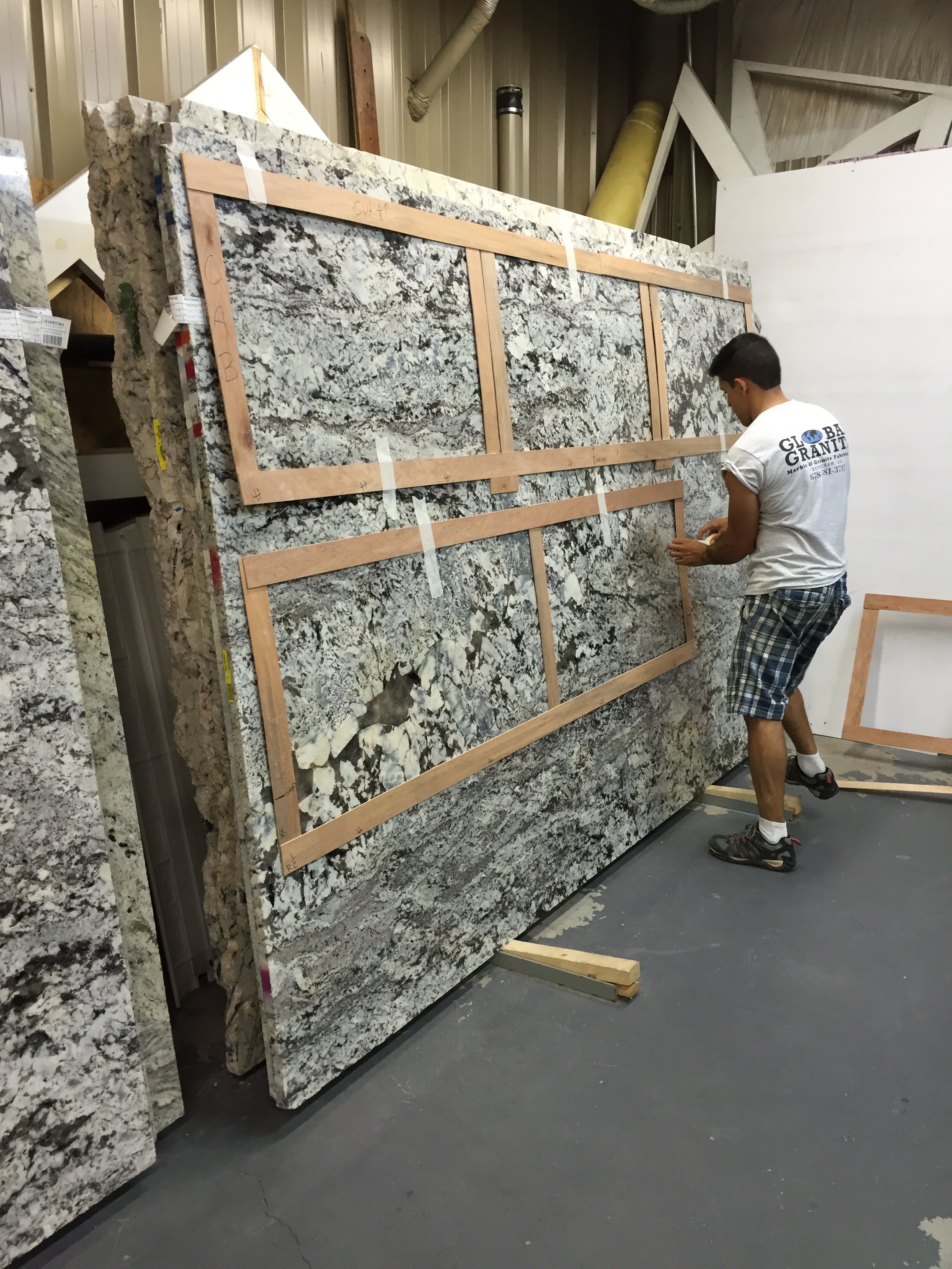These pictures are of our counter top templates laid out on the slabs the way we want. (We asked to come back in after the template was done to do this.) Granite has natural variation so selecting your actual cuts is a way to help ensure you get the beauty of the stone you picked! A 3″ square sample doesn’t do justice or show the true granite patterns of an 8′ slab.