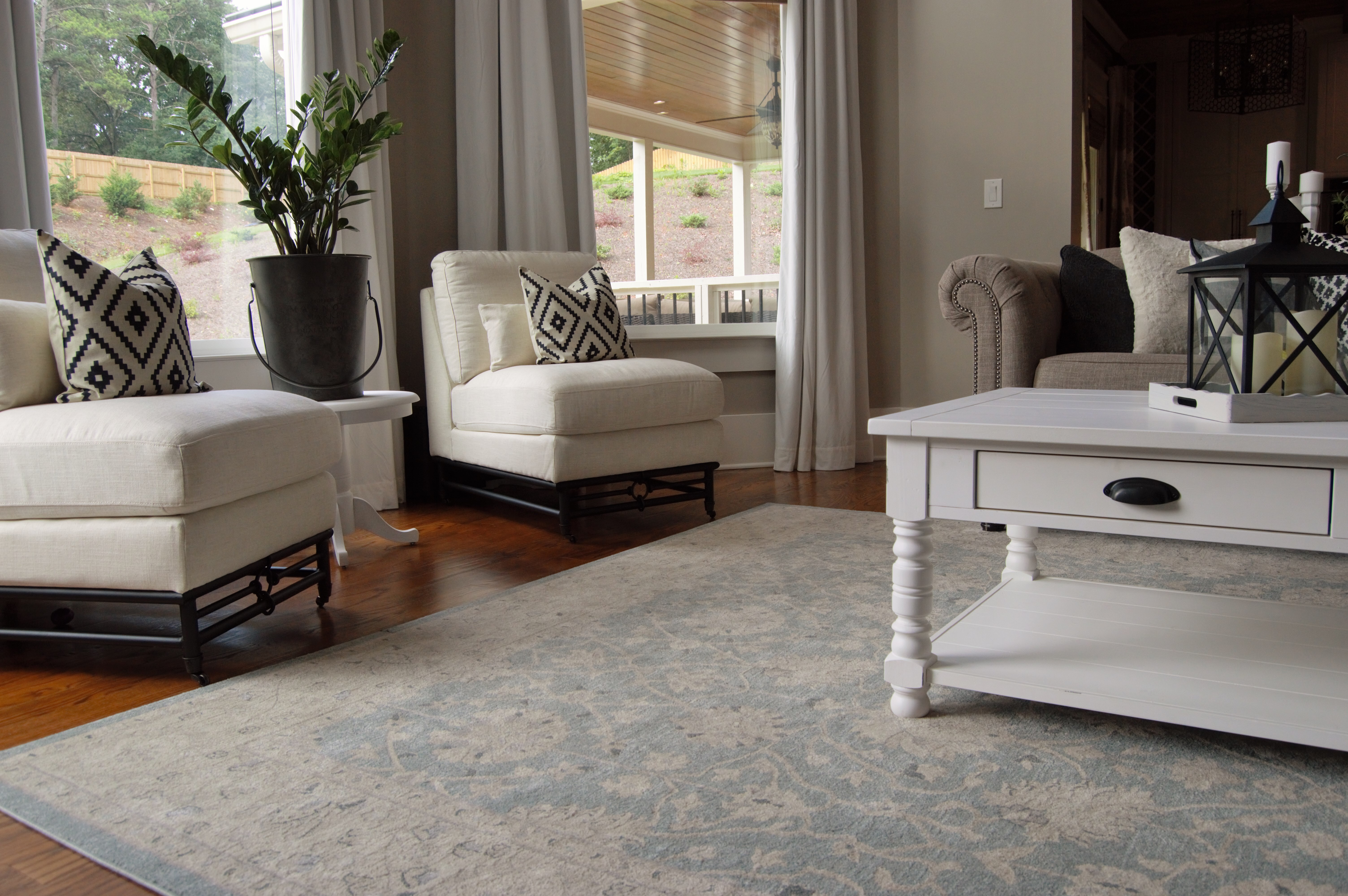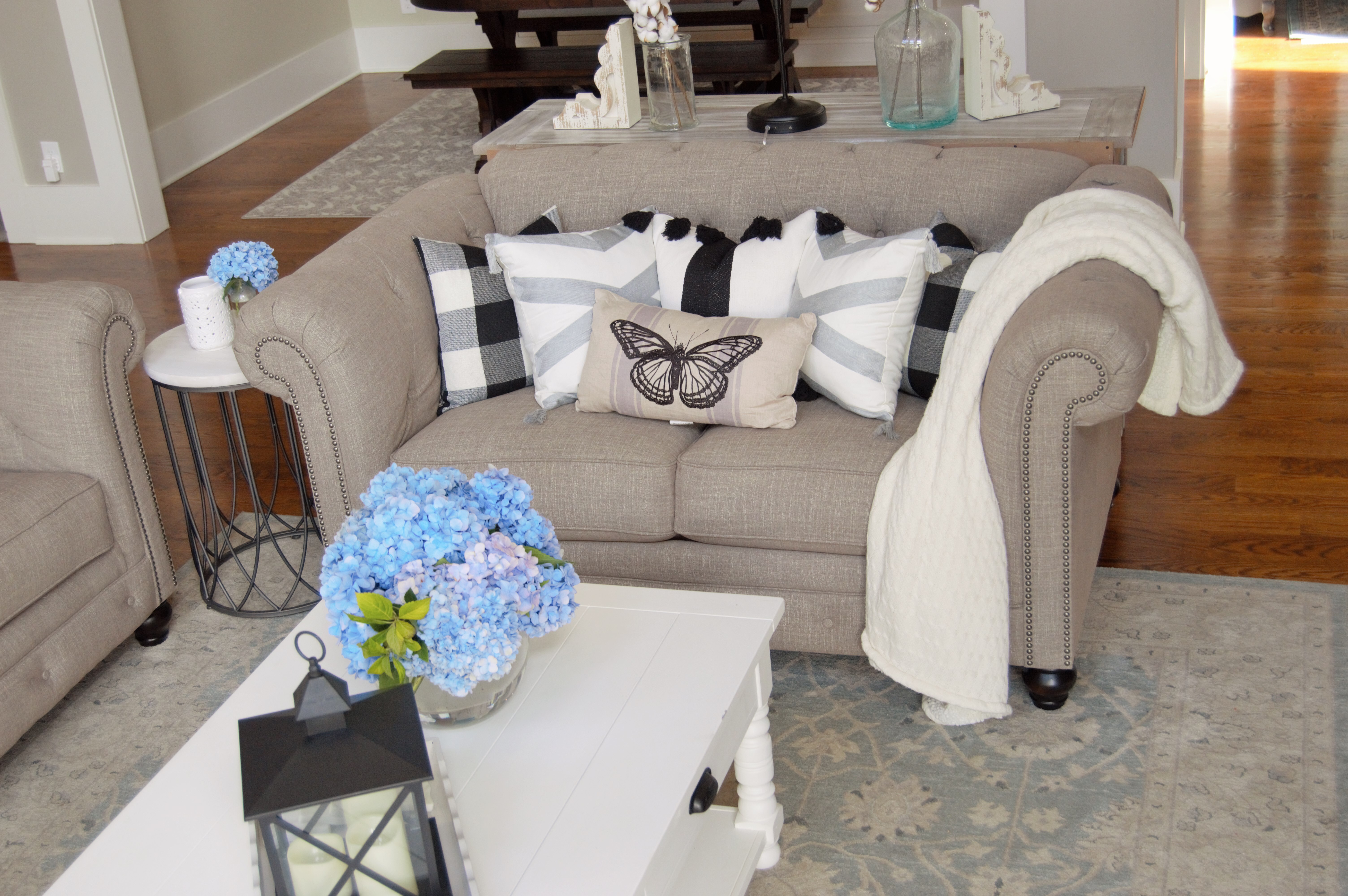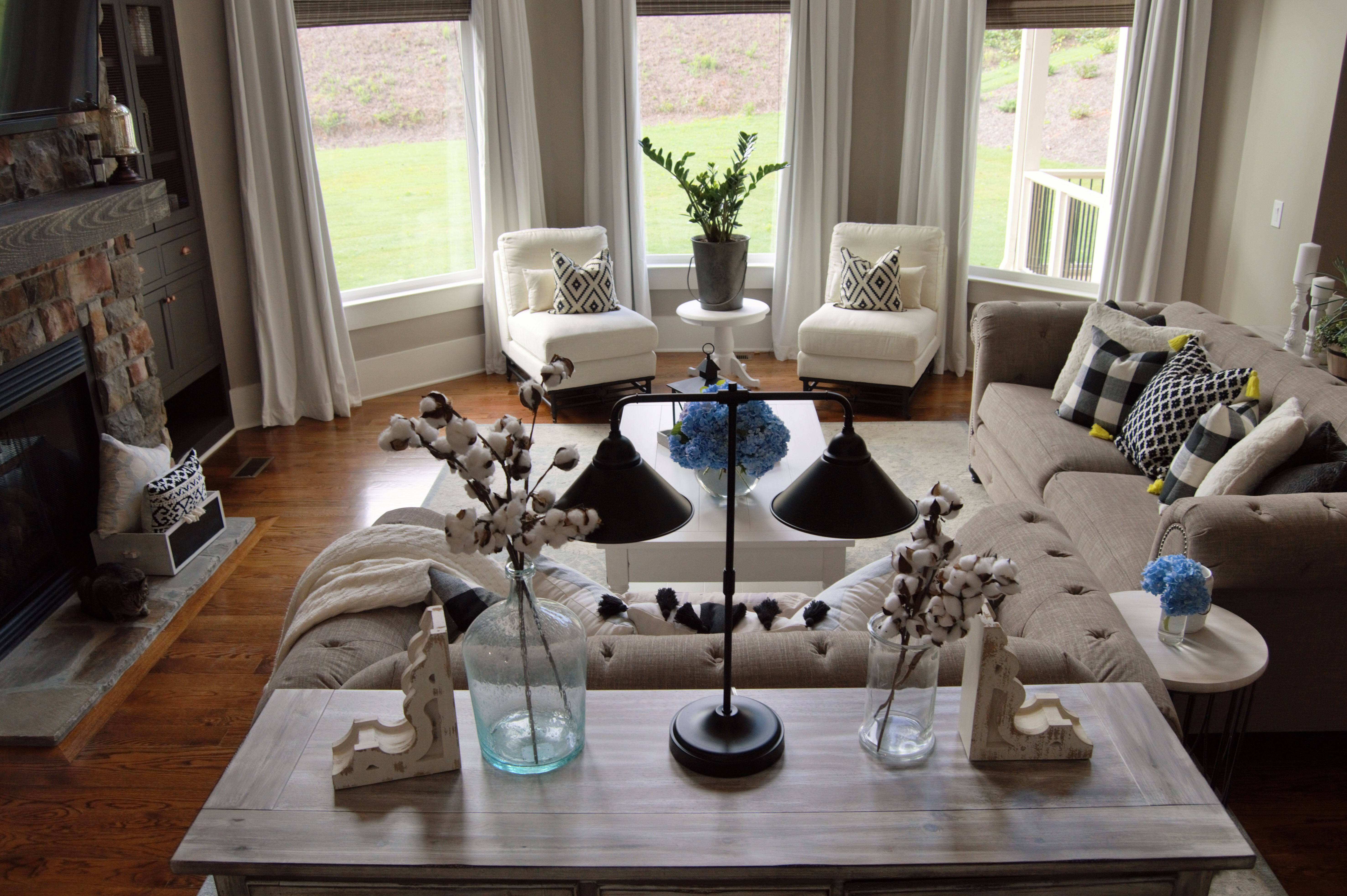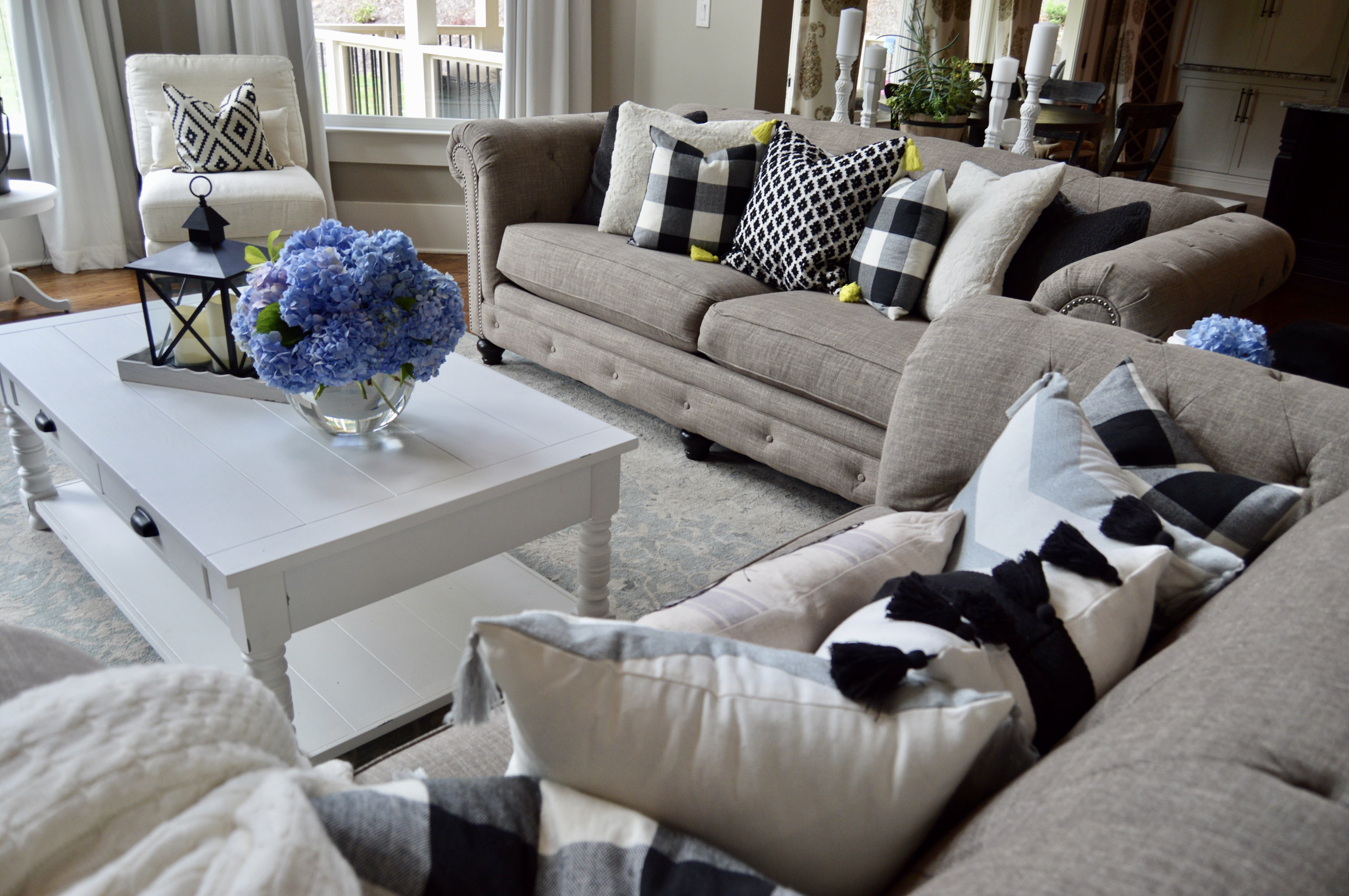 Sofa| Loveseat | CurtainsGeo Tile Pillow Chadelier | Rug | Coffee Table | Chairs (Magnolia Home- American Signature)| Console Tables (Home Goods) | Planter Bucket | Accent Table| Metal Accent Table (Home Goods) | Gingham Pillow Cover | Marble Coasters