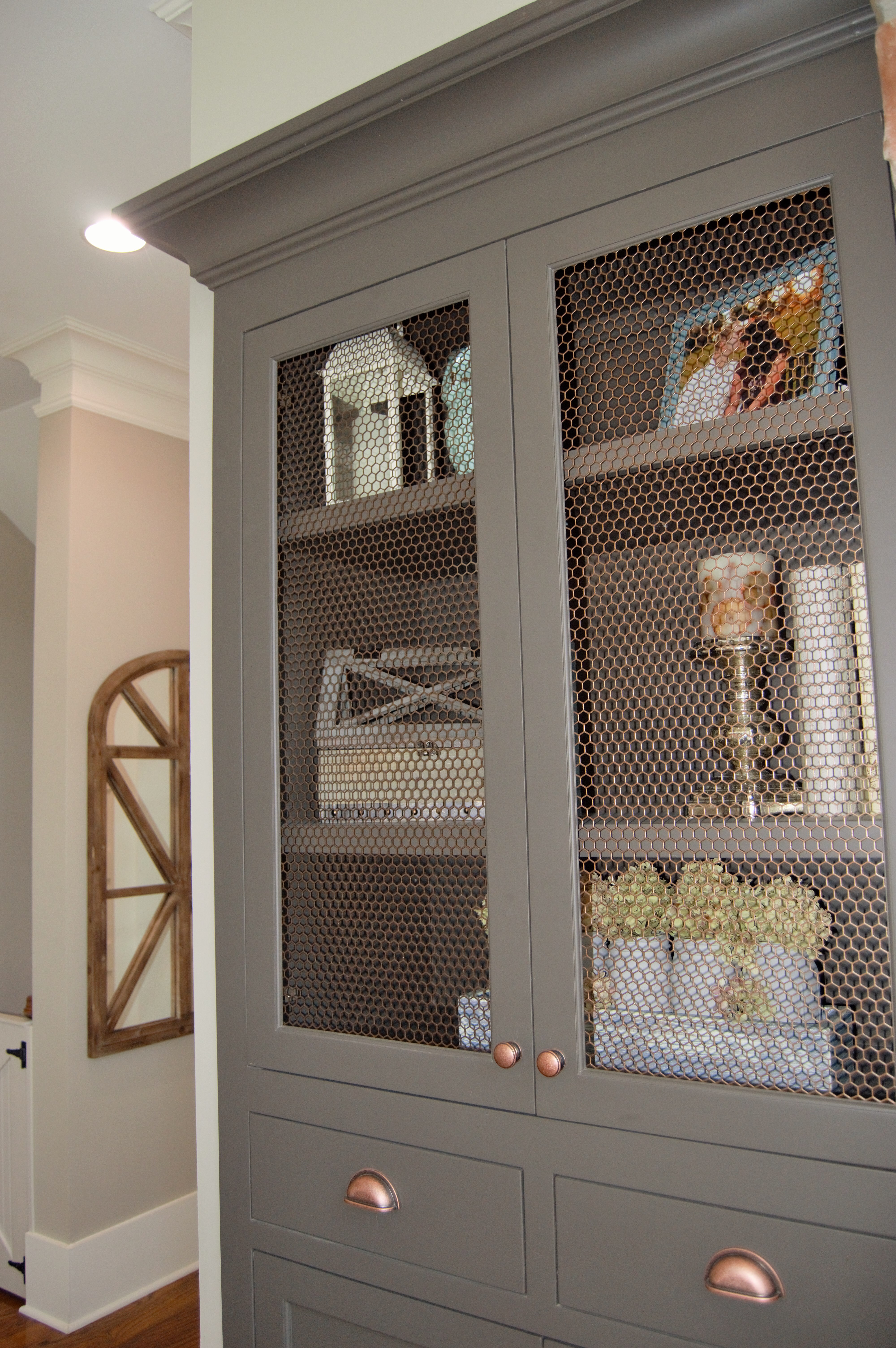 My husband and I own a cabinetry company in Atlanta, we designed and built all of our cabinets. The built-ins are painted in Sherwin Williams Urbane Bronze and the walls are Sherwin Williams Amazing Gray.  The built-ins have metal mesh in the doors.