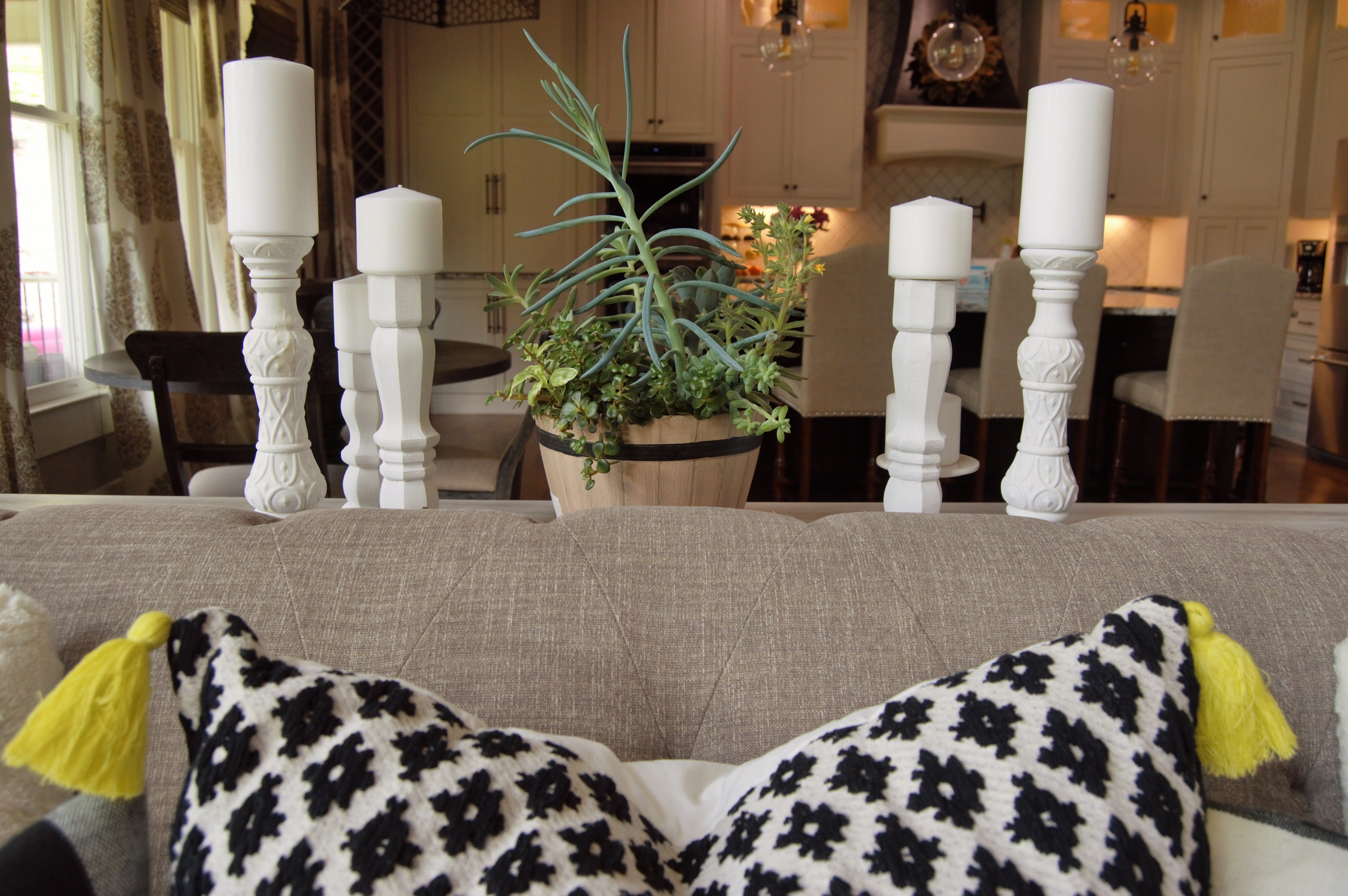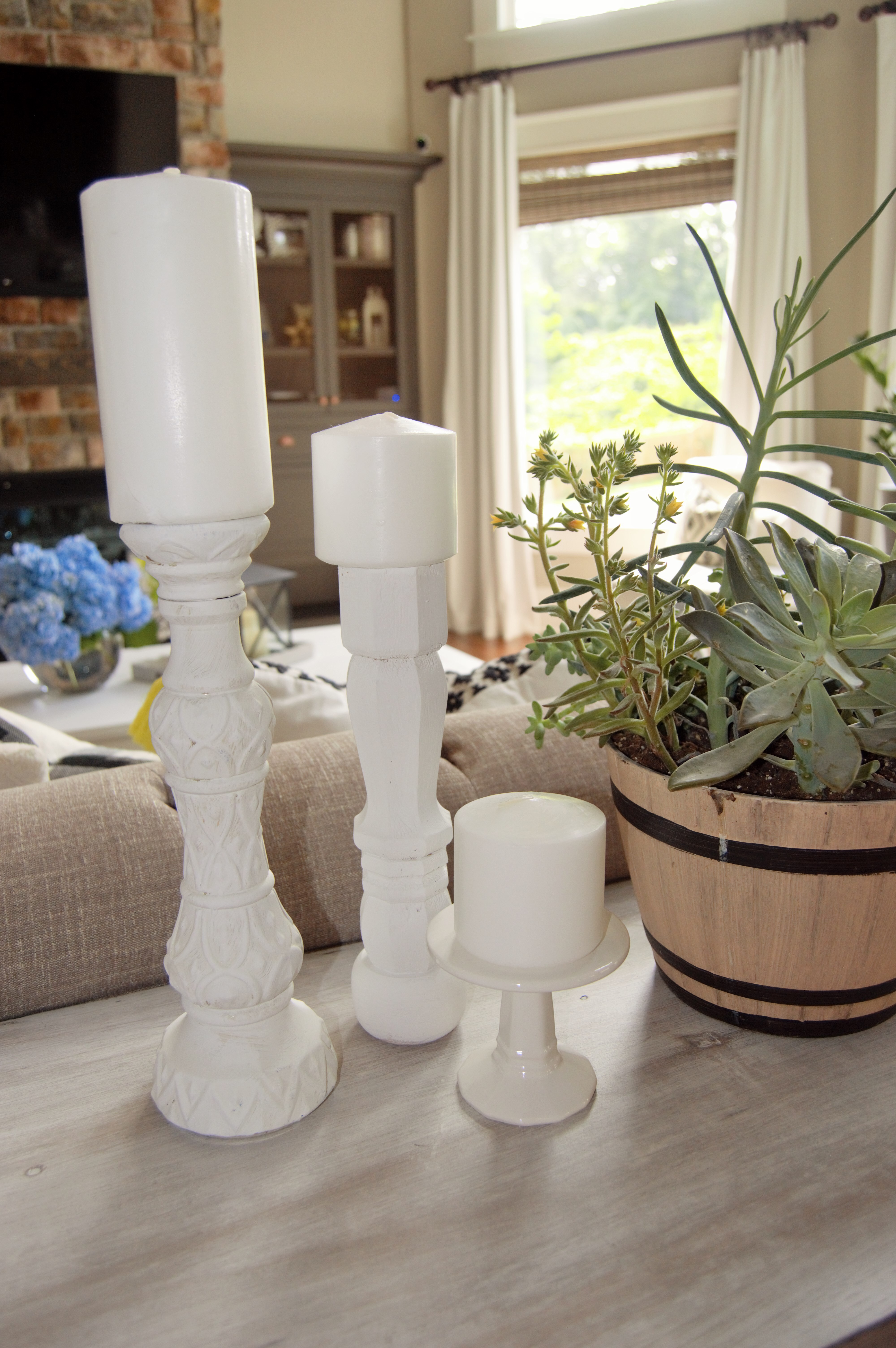 Both consoles tables are from Home Goods. I made the small candle sticks from table legs from Lowe’s. The tall ones are some kind of bottle I found at Goodwill painted with chalk paint. The farmhouse table lamp is from Target and is the perfect accent to our chandelier.