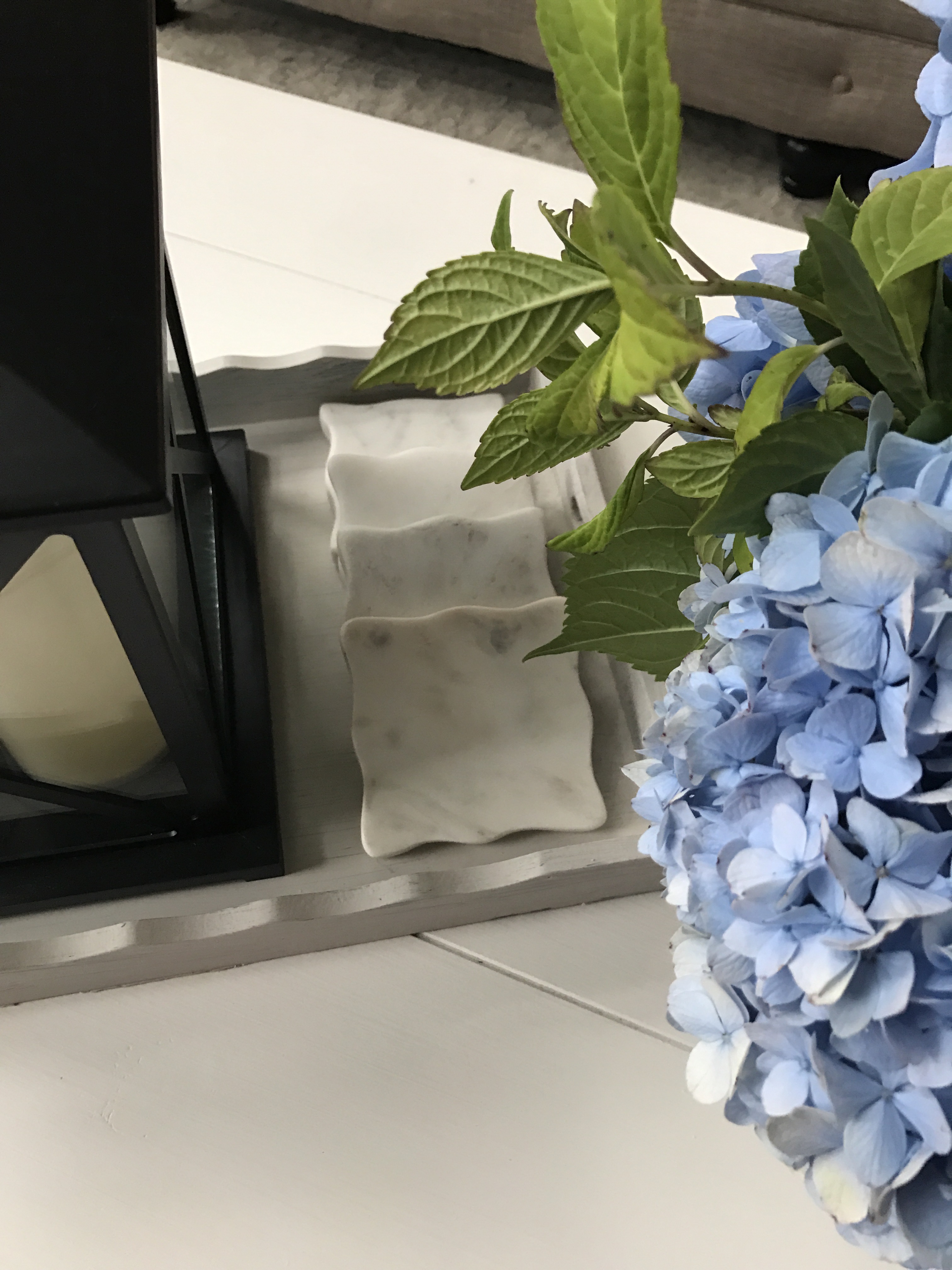 I found the lantern on the table at Big Lots, the tray at Hobby Lobby that I painted with chalk paint, and the coasters at Bed Bath and Beyond.