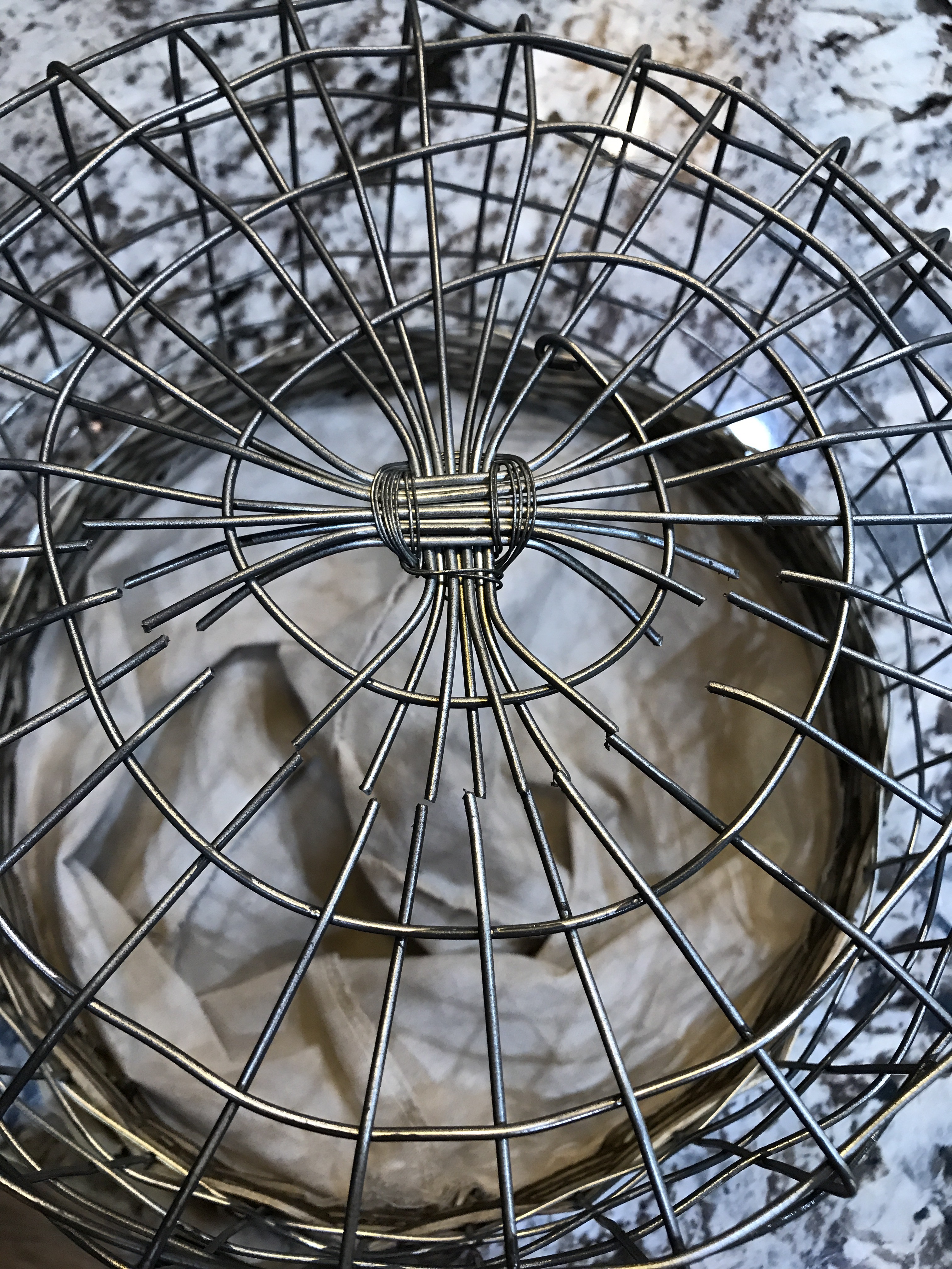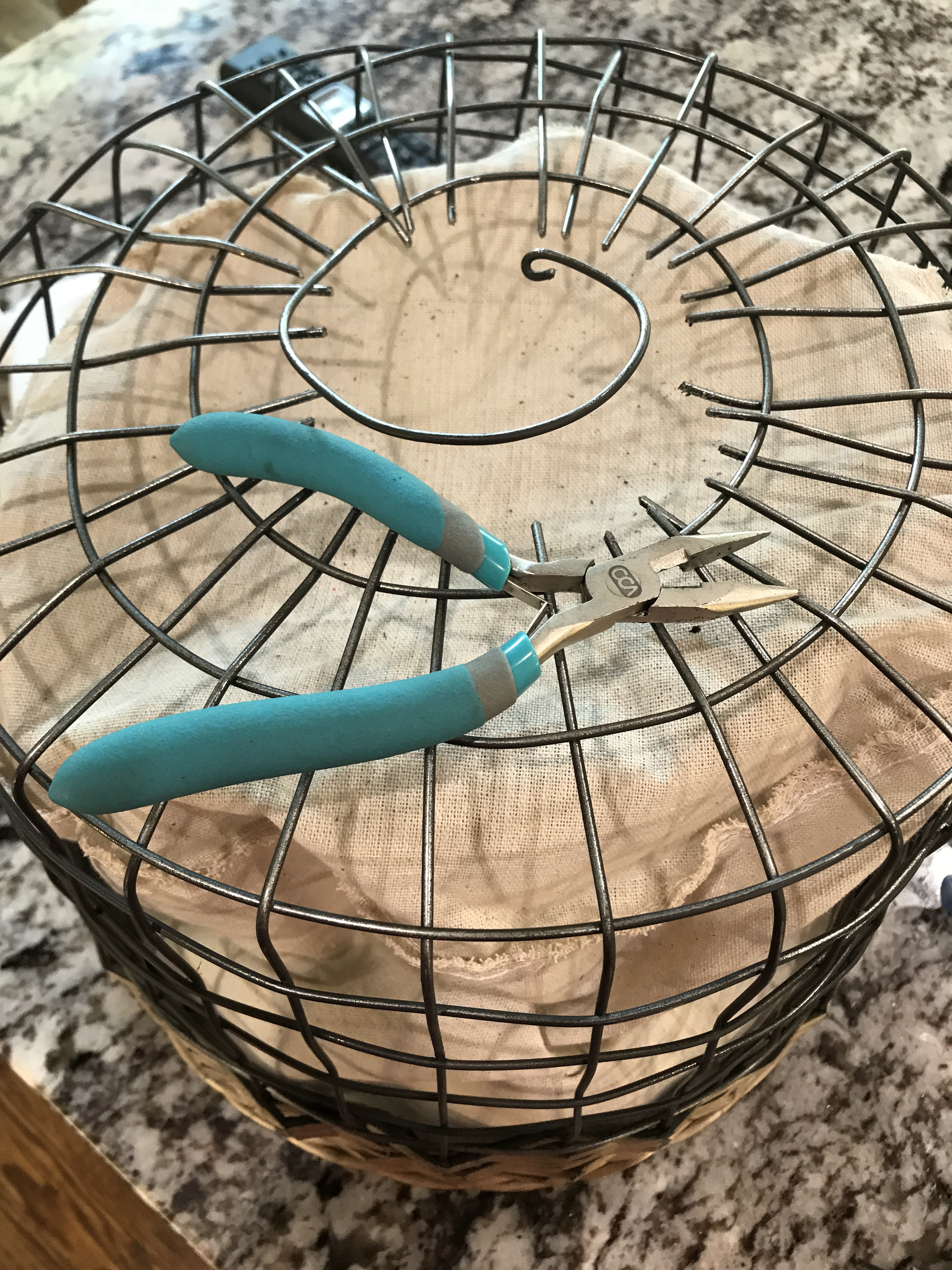 I used a wire cutter to cut the center of the bottom of the baskets, in a circle. I did this so it would slide onto my exisiting pedant. I used the fabric to create a border and conceal the sharp edges that were cut.