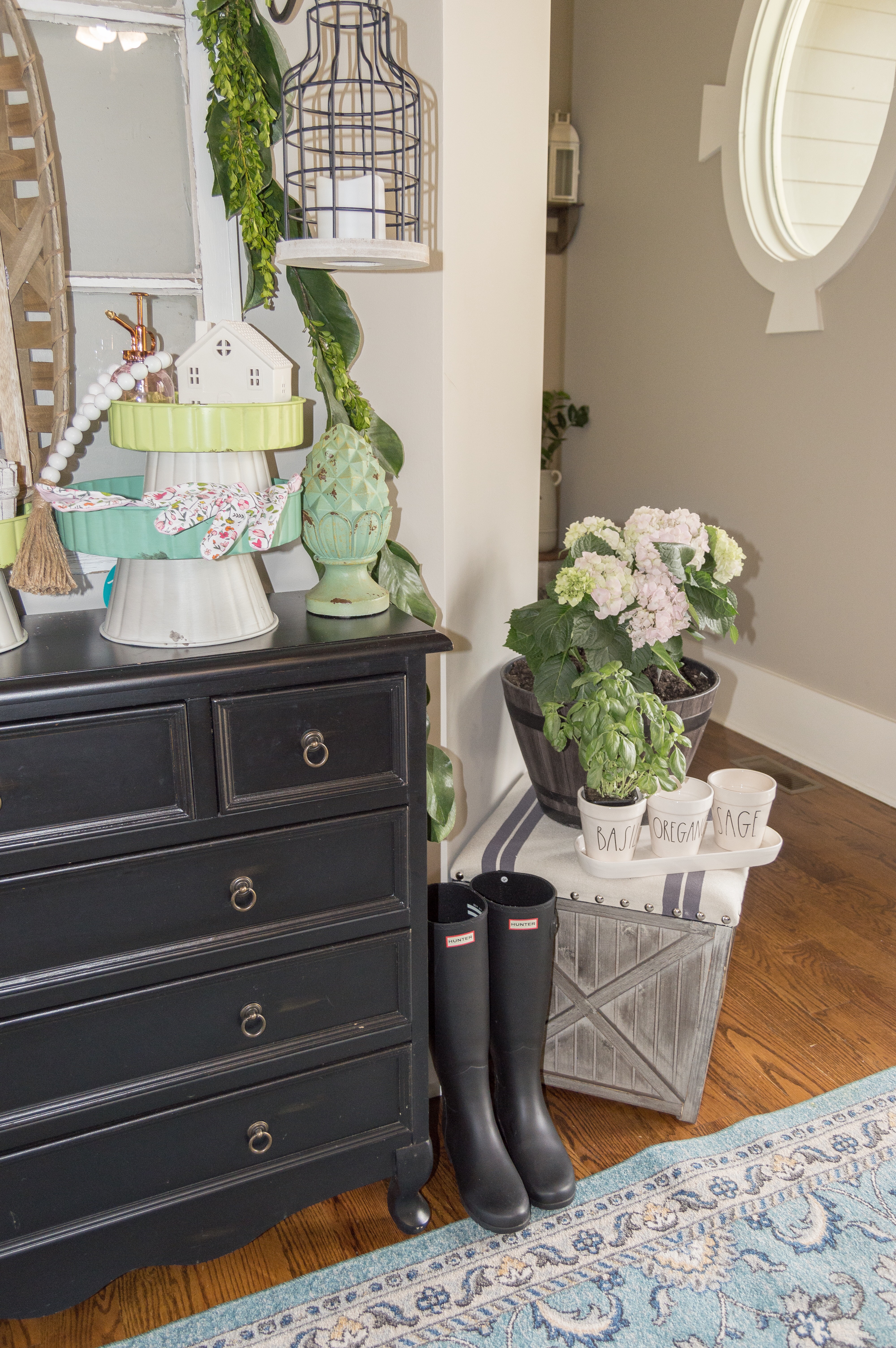 I used these pedestal servers as a gardening supply center drop. I have some flowers planted along our front porch so, I plan to use this spot as my garden drop. My gardening gloves, trowels, and watering cans can be left here on the way in to the house.