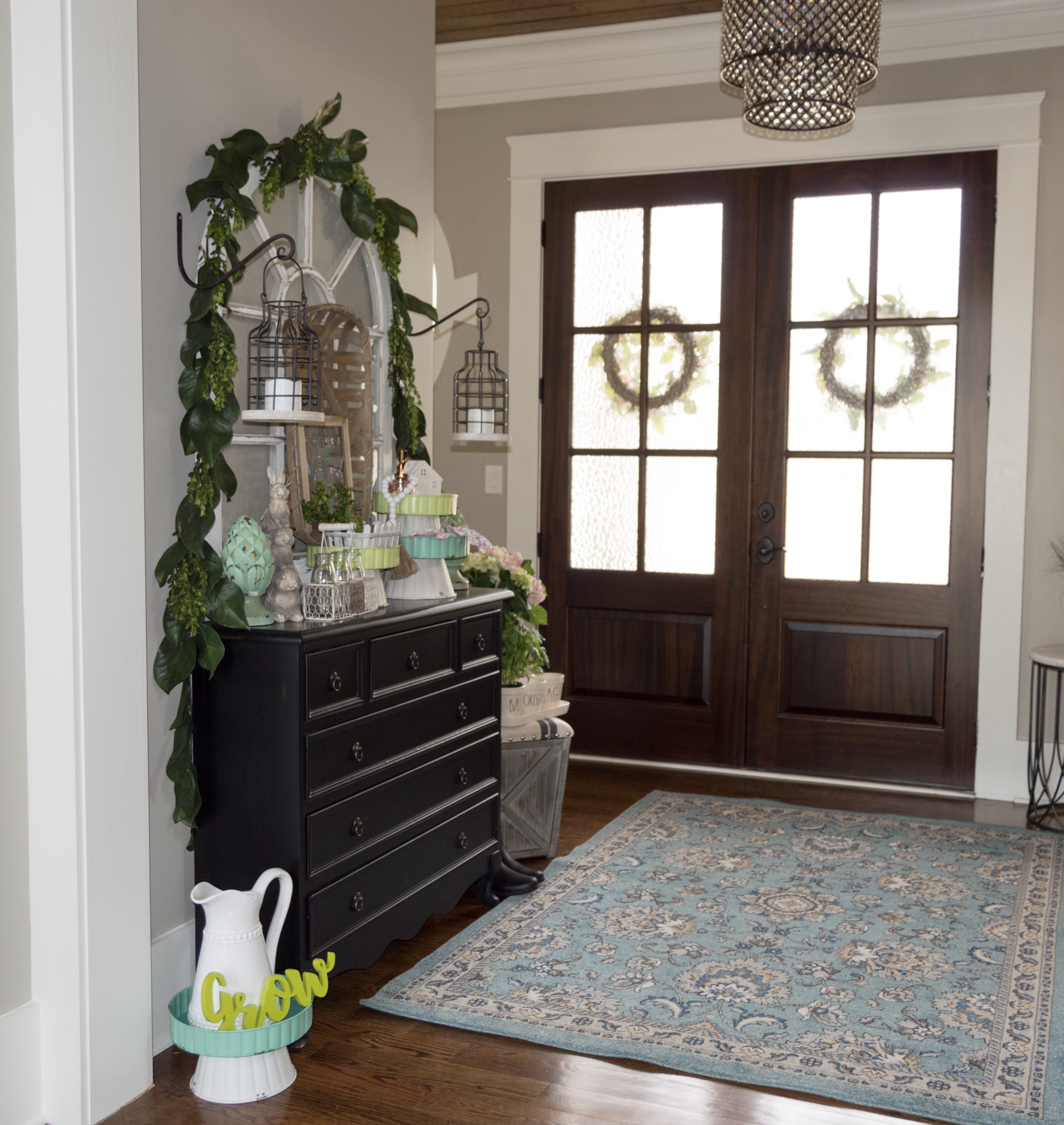I stacked a large and small pedastal server together to give more dimension. This small house I used in my Christmas decor doubles as “green house” decor in my garden center.