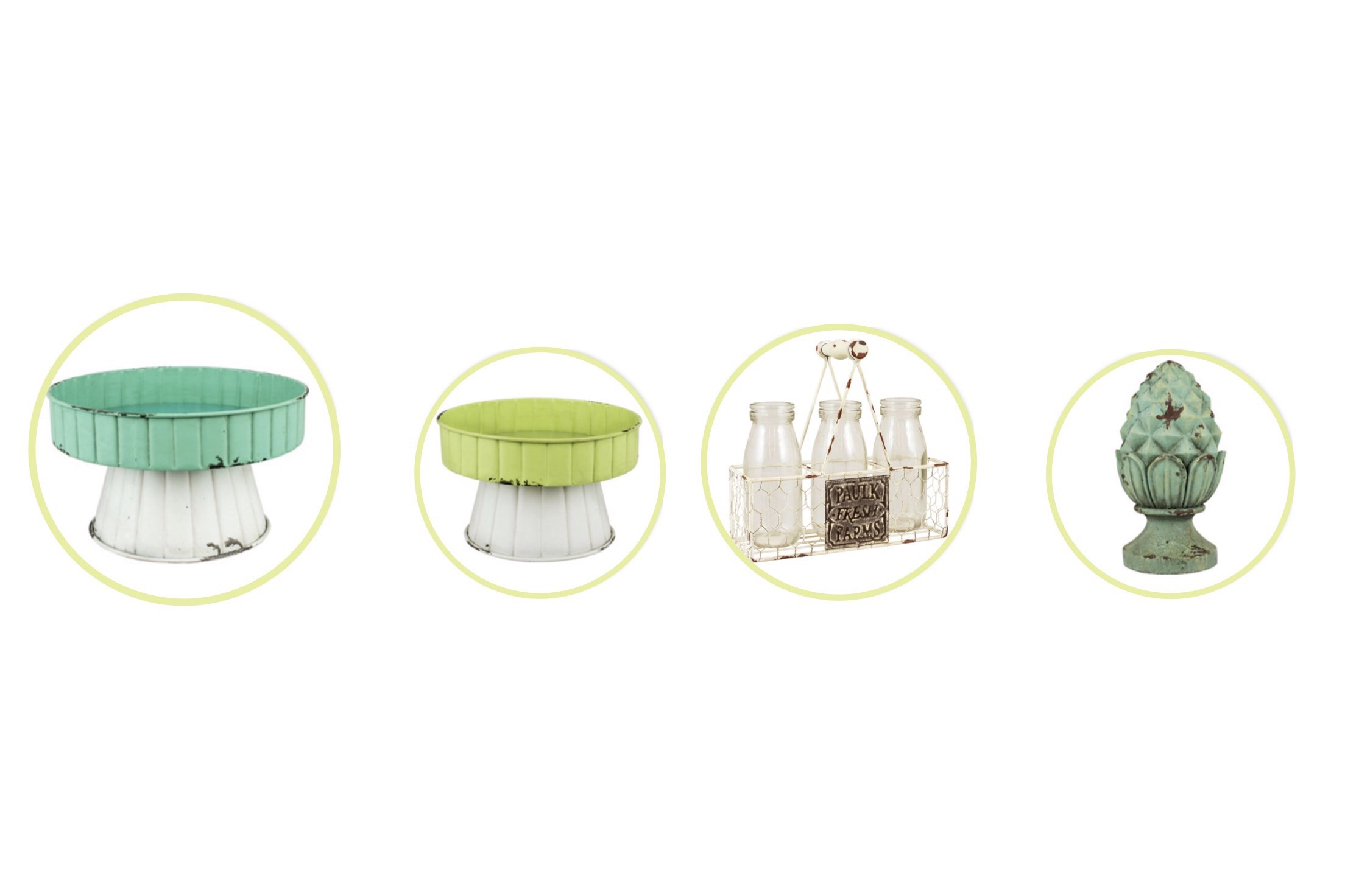 The pieces I chose from the line are the pedastal servers (green and teal), the adorable finials, and the milk bottle carrier.
