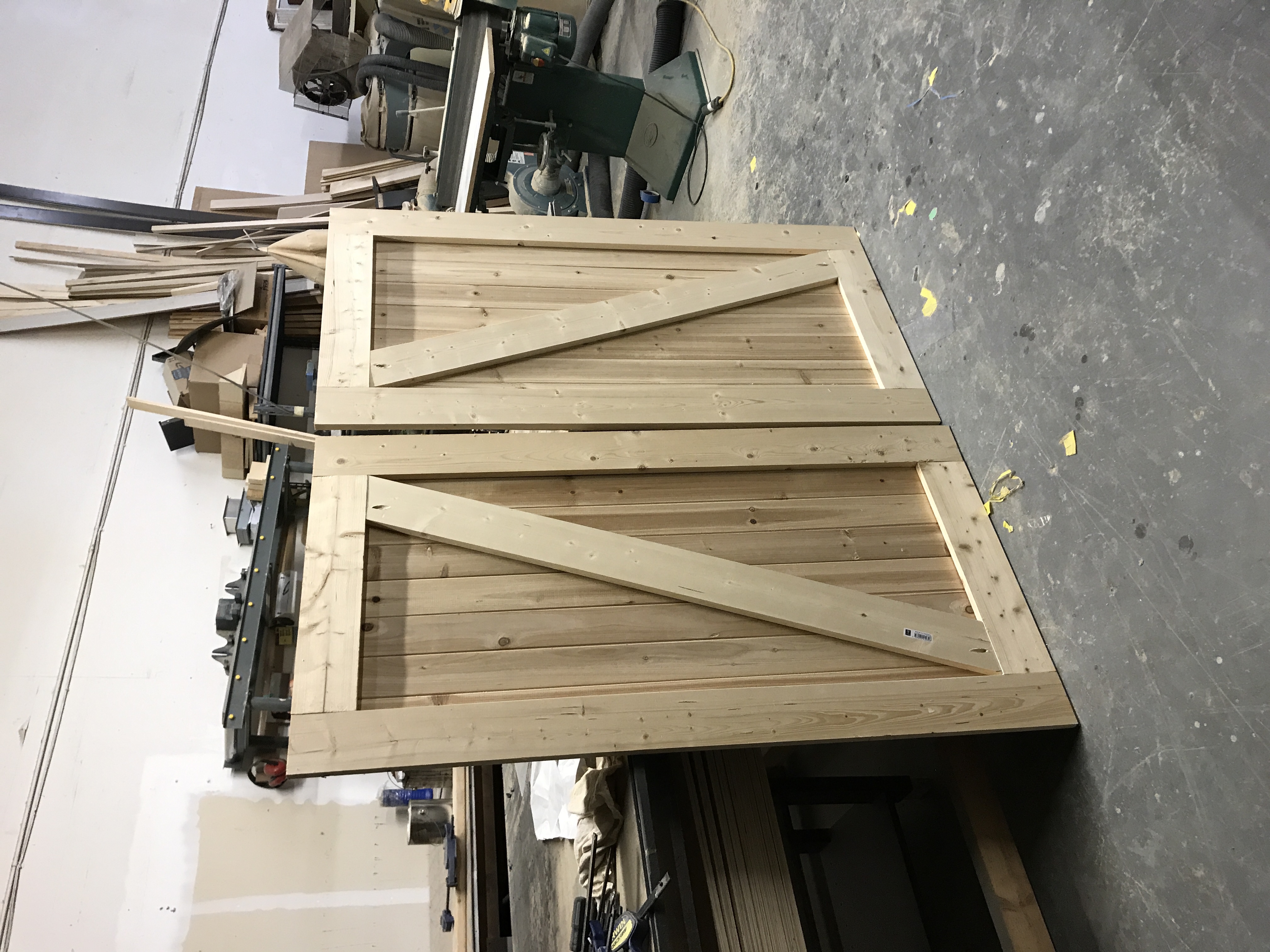 - After door frame is assembled align 58″ cedar planks along the back of door being sure to have the grooves meeting tightly with each plank (I don’t have a picture of this step)
