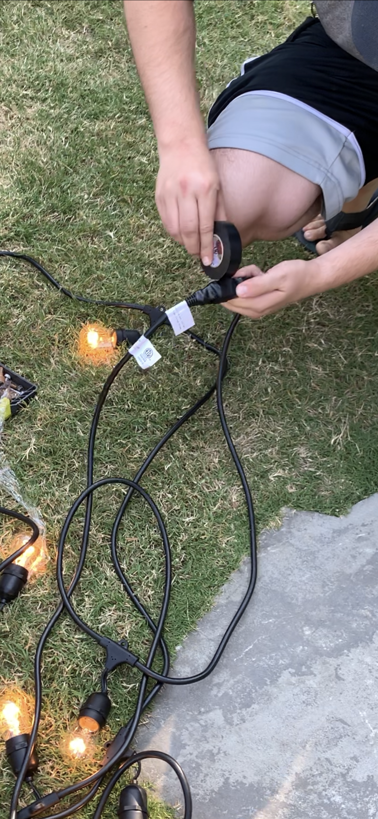 The string light sections themselves need to have a knot tied so the plugs don’t pull apart. Once the knot was tied, we then wrapped it from the base of the cord around to the connecting cord base. in electrical tape to protect from precipitation.