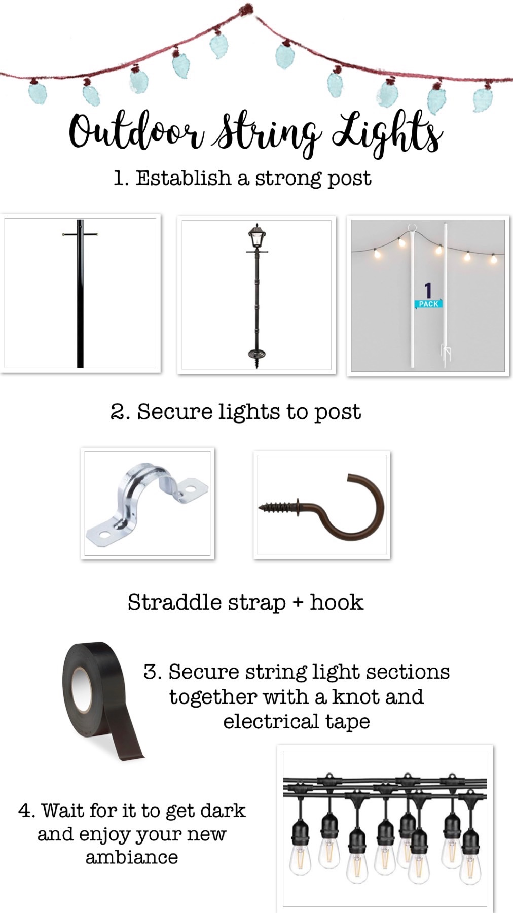 The solution also entailed ensuring the strings had solid support. We added a saddle strap to lock the string light cord onto the poles, in addition to a traditional hook. With more poles to hold the weight, a more secure way to attach the strings together, and also a more secure way to attach it to the pole, the outcome was success!