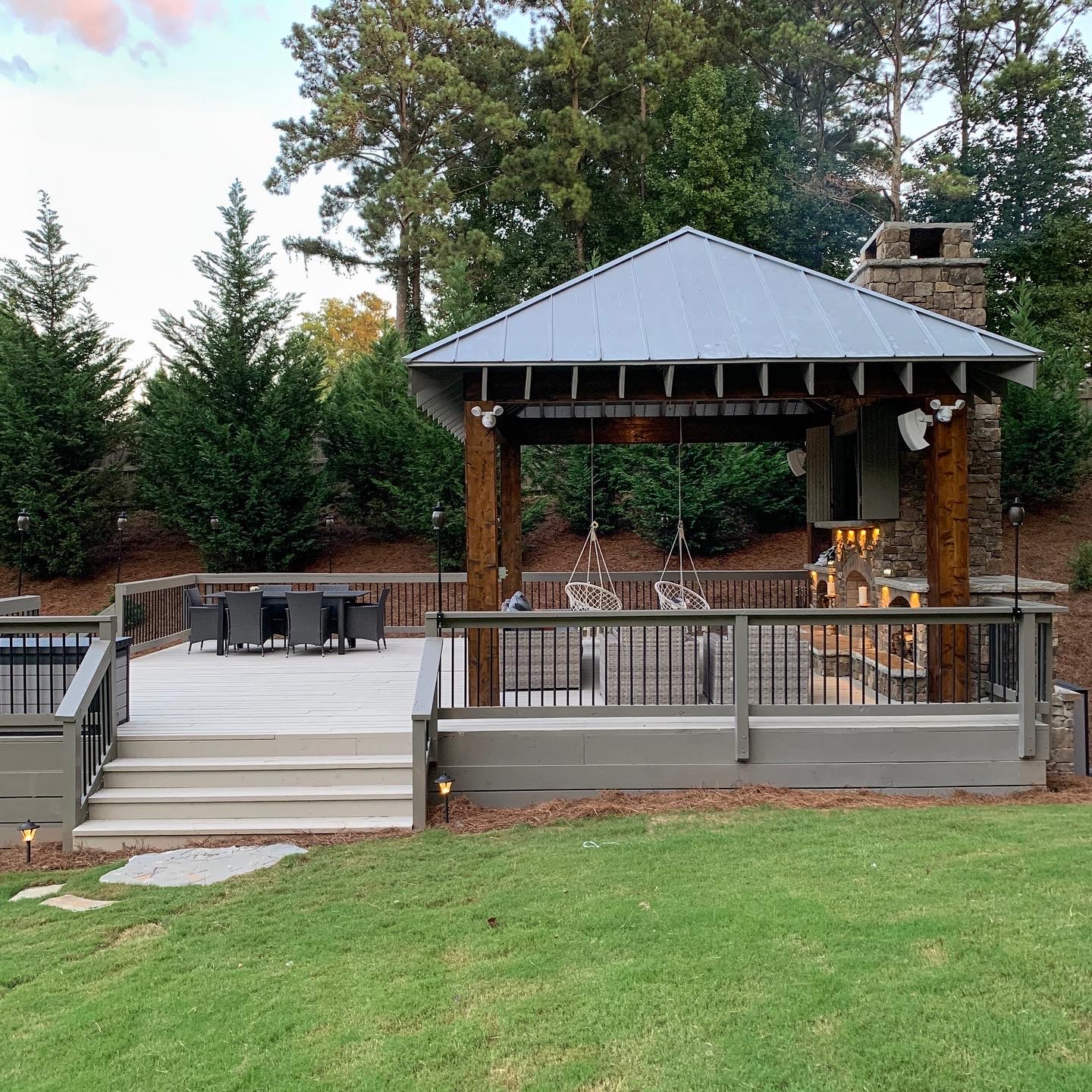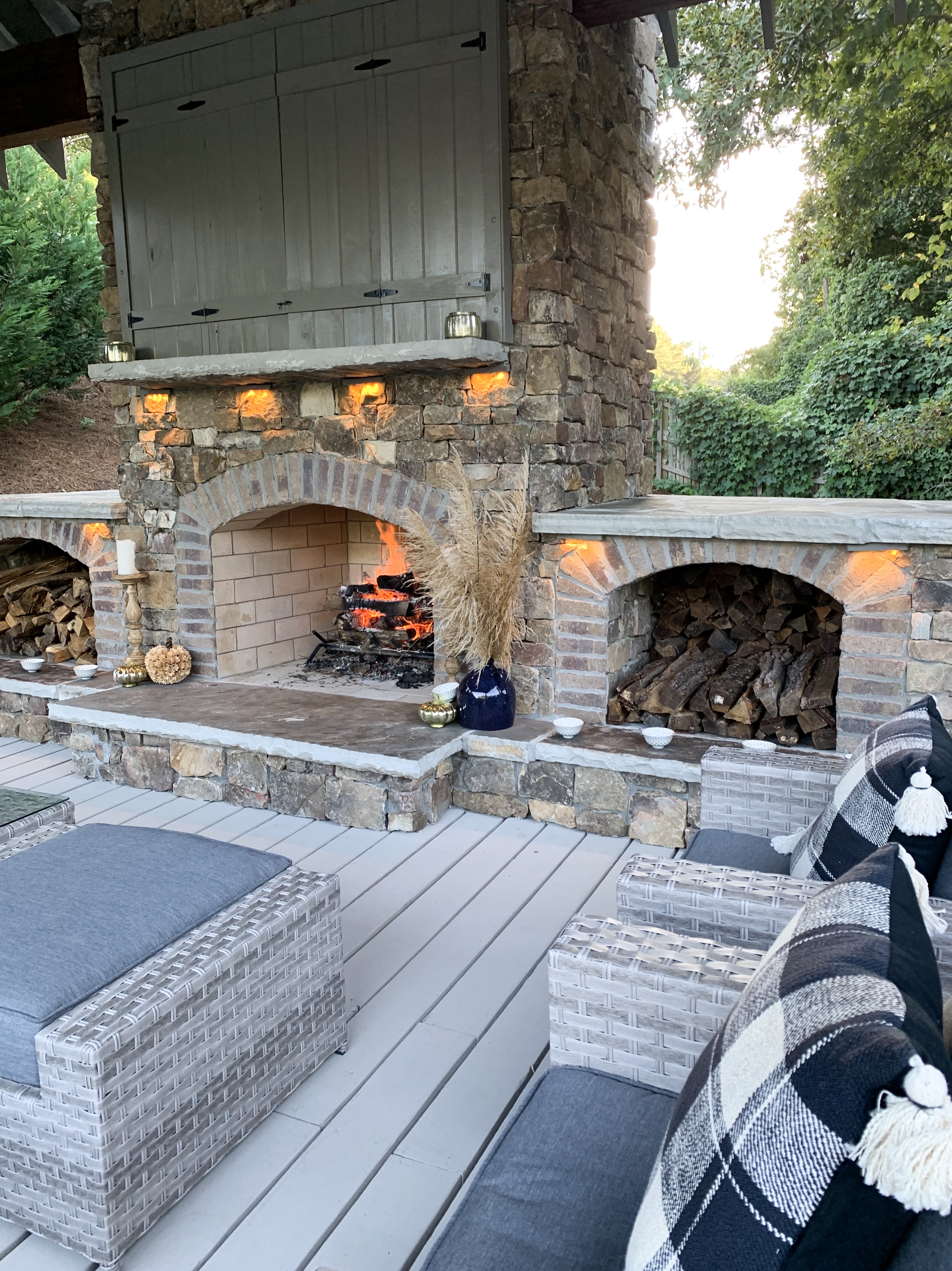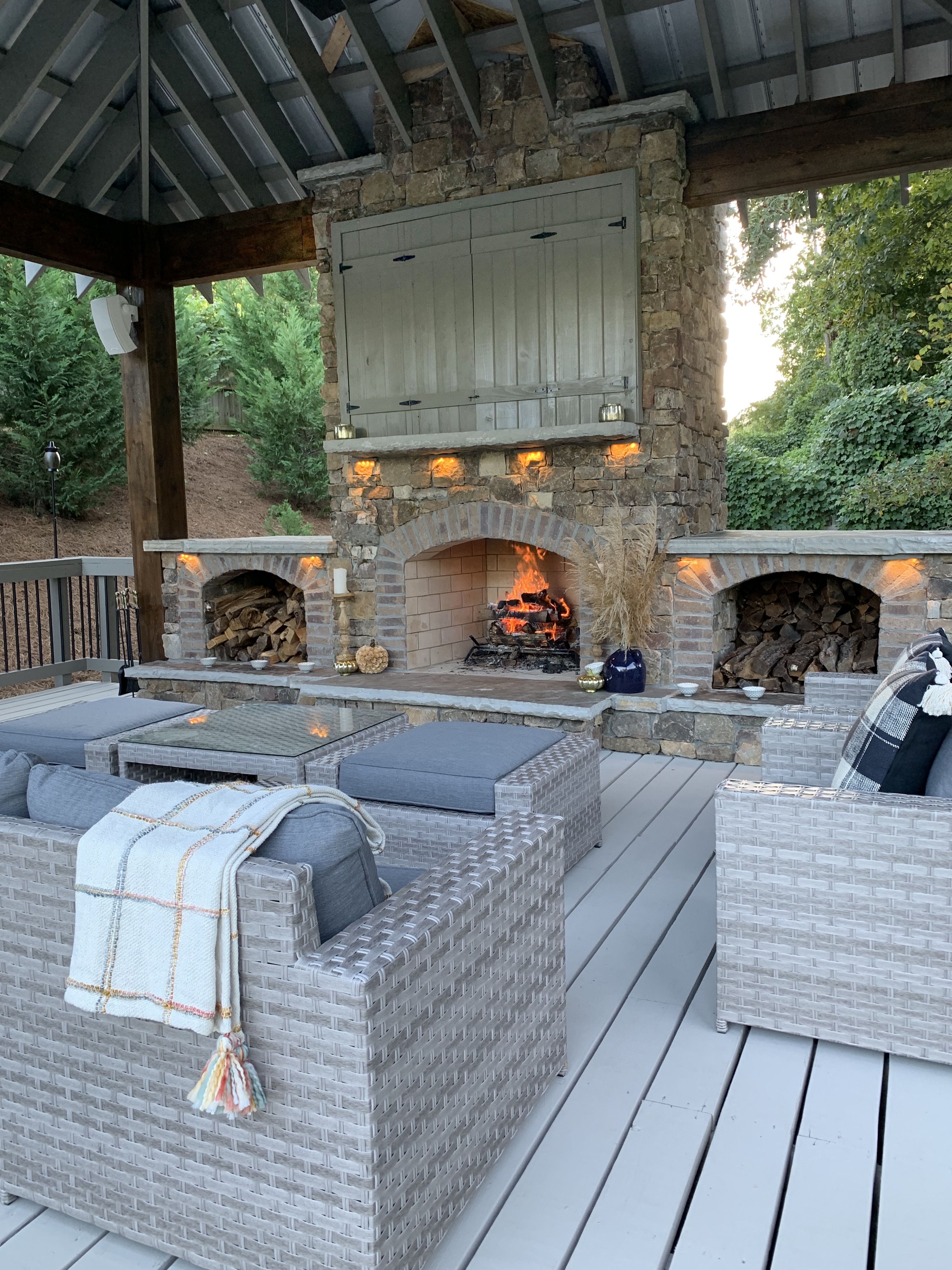 I took you guys along as we built our our “new to us” gazebo (one man’s trash, is another woman’s treasure) over the summer. My dad is a contractor and a house he renovated was removing this beauty. I quickly volunteered to take it off their hands. We built a deck for it to sit on, and a fireplace to keep it all warm and toasty.