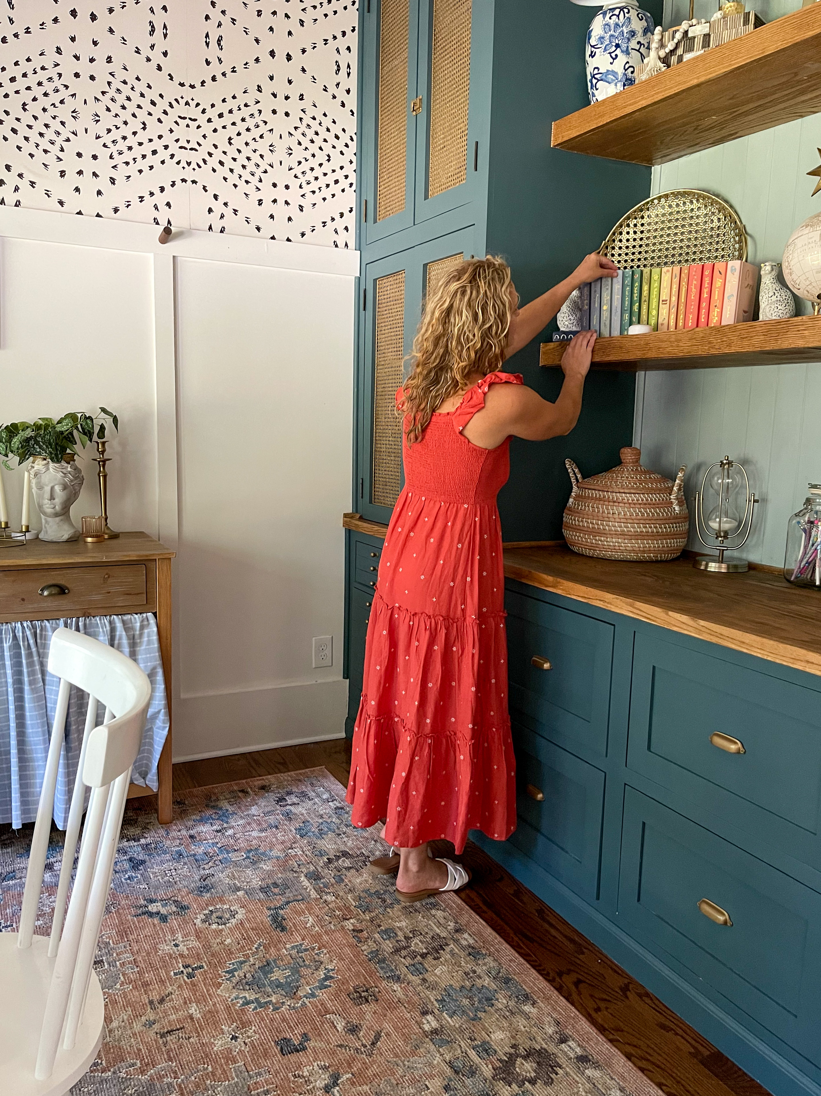 My dress happened to match well with the decor today so naturally, I snapped some shots while working and cleaning up. I’ll link it along with my shoes. It’s super flowy and comfortable for hot summer days!