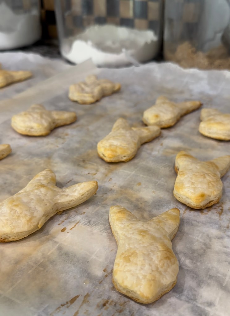 These were super easy; only a few steps to a fancy dessert! I followed the instructions on the puff pastry package, the only difference being, I cut the dough into shapes. I used a bunny face cutter, but any shape would be fine. The large the better. Smaller areas could puff together as it bakes.