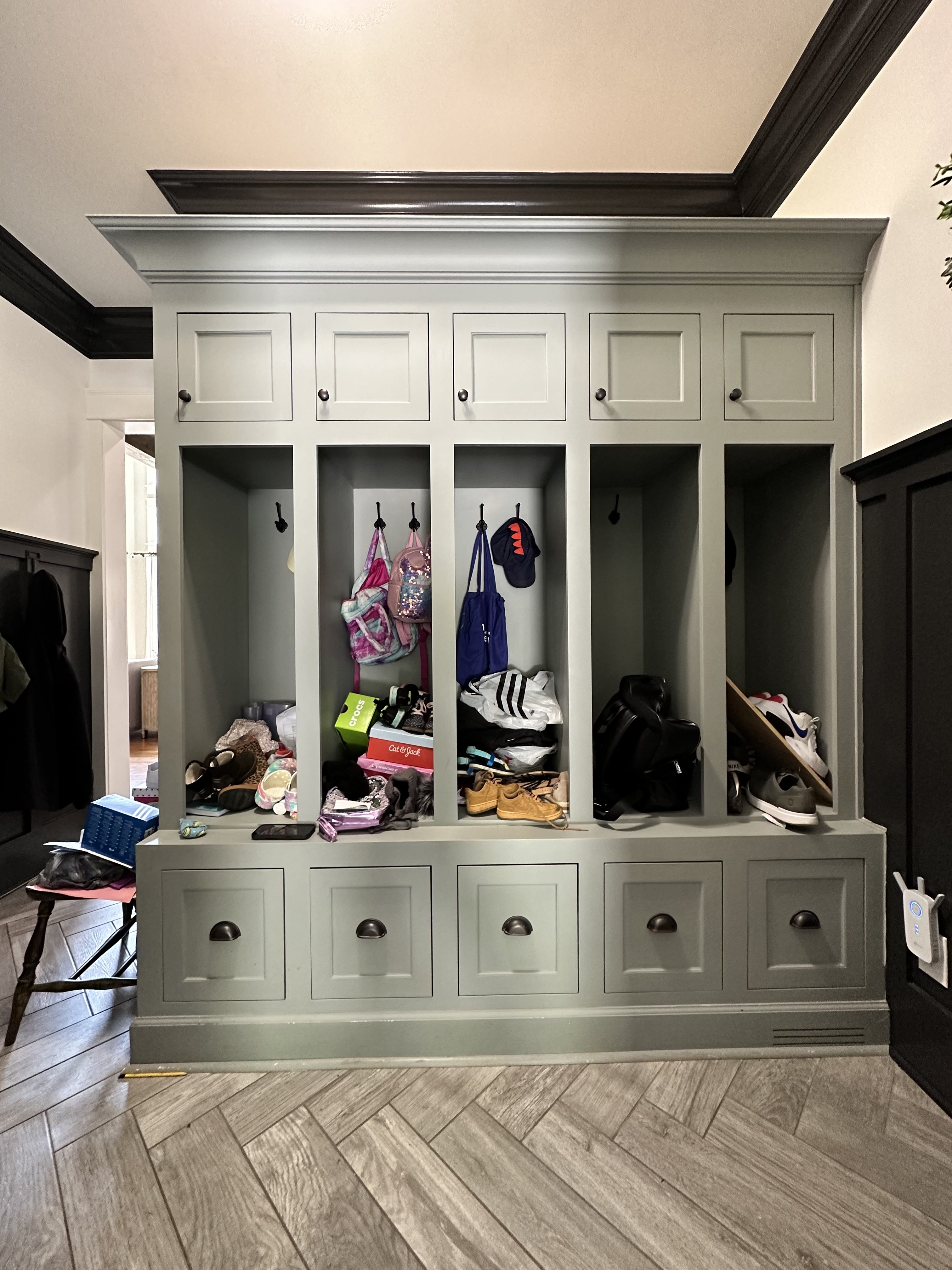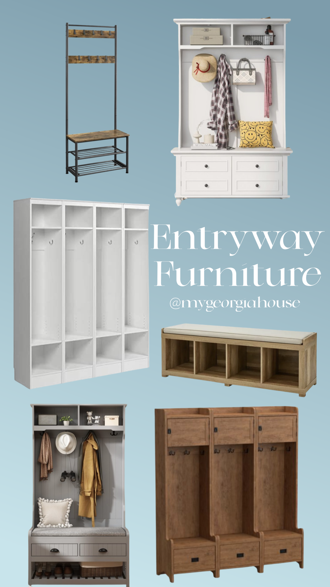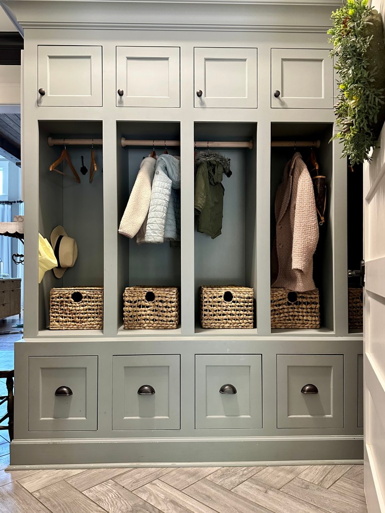 Lockers are a luxurious way to organize and add function to any space, but they are typically seen in entries, garages, and laundry rooms. They tend to be individualized and give each family member a designated spot to drop their things. I found some lockers and entry cabinets that range from $ to $$$. Lockers can be created from hall trees or just using hooks and baskets to create the same function.