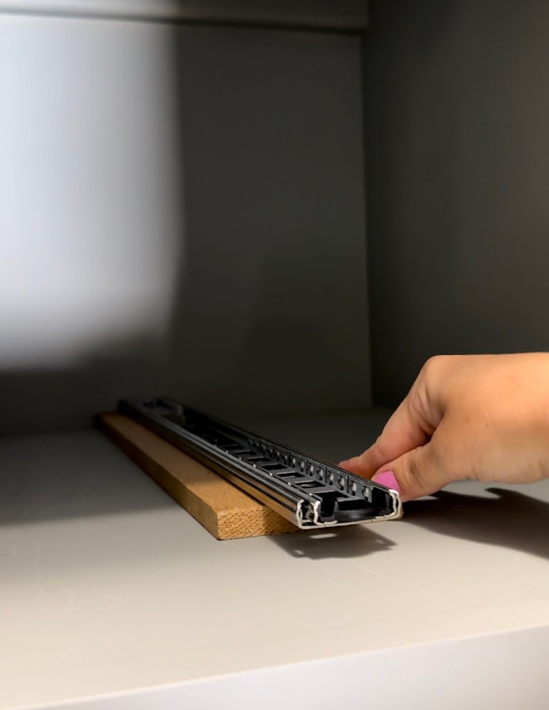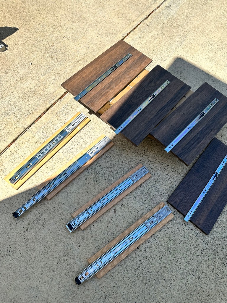 The shelves (SHOP SHELVES AT LOWE’S) come in a bunch of sizes and colors. They can be cut to size or may find the perfect one. Drawer slides (SHOP DRAWER SLIDES AT LOWE’S) also come in lots of sizes, I prefer soft close varieties. I used a side mount 20″ soft close drawer pull. I used an eye like hook (SHOP HOOK AMAZON) for the handle. Any baskets will do, I plan to use velcro to attach them so they don’t slide.