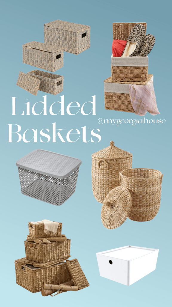 Baskets are a great go to even without a more structured system like lockers. Even a simple basket per family member system could be enough. I love baskets that offer lids and stackable options. Labeling the bins and baskets is also an important step.