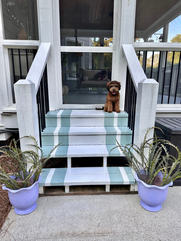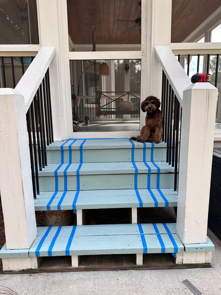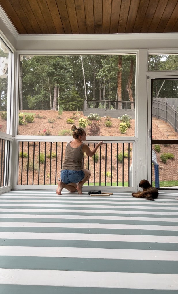 Over time the unfinished floor on our screened porch got majorly dingy. I decided to act on a design idea I saw years ago, implemented a bit differently, a gorgeous party room had stained light and dark wood in a stripped pattern I just loved. Here I decided to use paint because I wanted an impact of color.