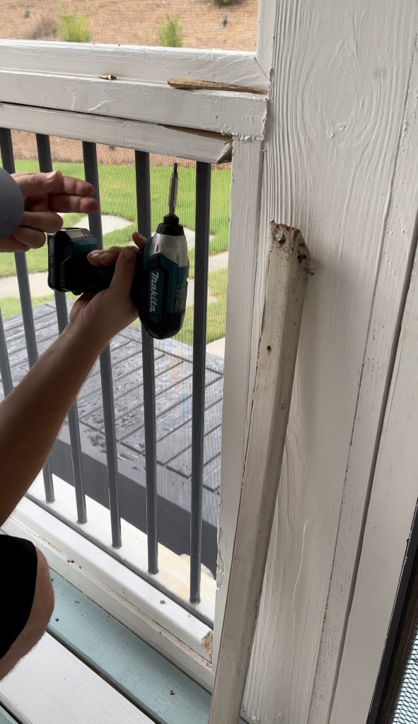 We had to recently replace a damaged screen which gave me an opportunity to show how this is constructed. A custom screen with a metal frame is inserted in between two sets of 2″x2′ blocks. One set to the outside of the porch and the other inside. Here Vlad is removing the inside blocks to access the screen.