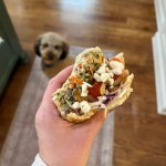 I added our burgers to pita like bread pouches with slaw, tomatoes, sautéed onions, feta, and tzatziki sauce.